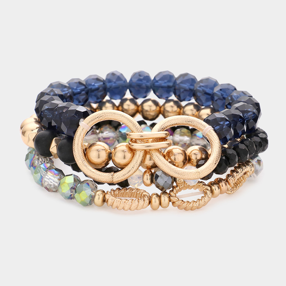 / 4PCS – Semi Precious Stone Pointed Double Open Metal Circle Link Faceted Beaded Stretch Bracelets